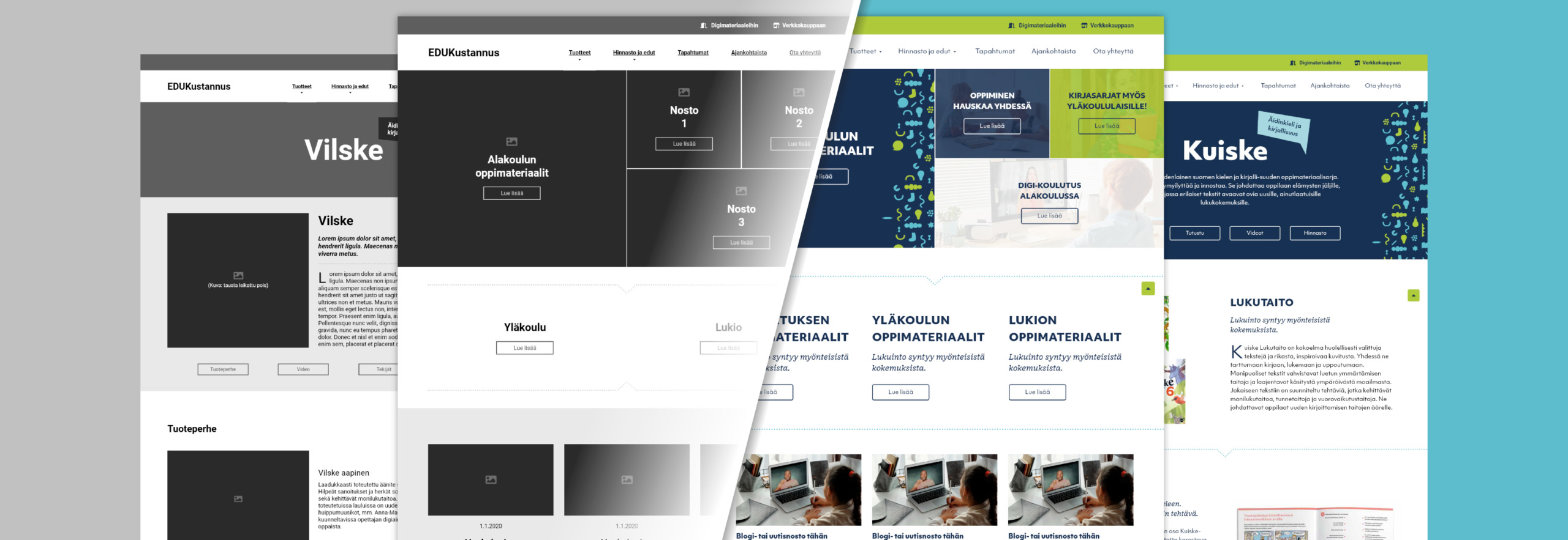 Hahmottelimme Edukustannuksessa toiveitamme siitä, miltä uudet verkkosivut voisivat näyttää ja millaista sisältöä sivuille pitäisi voida tuottaa. Oppimateriaalikustantamolle tärkeintä on, että sivulla vierailevat opettajat löytävät etsimänsä oppiaineiden materiaalit ja keskeisimmät tiedot tuoteperheistä vaivattomasti. Halusimme sivuille siis entistä selkeämmän ja muokattavissa olevan rakenteen, sillä vastaisuudessa haluamme tarjota sivuilla myös tukea ja vinkkejä Edukustannuksen oppimateriaalien käyttöön. Edukustannus on tuttu kouluissa eri puolilla maata, joten toiveissamme oli yhtä aikaa tutut, mutta visuaalisesti uudet, raikkaat ja selkeät sivut, joilla on helppo liikkua.