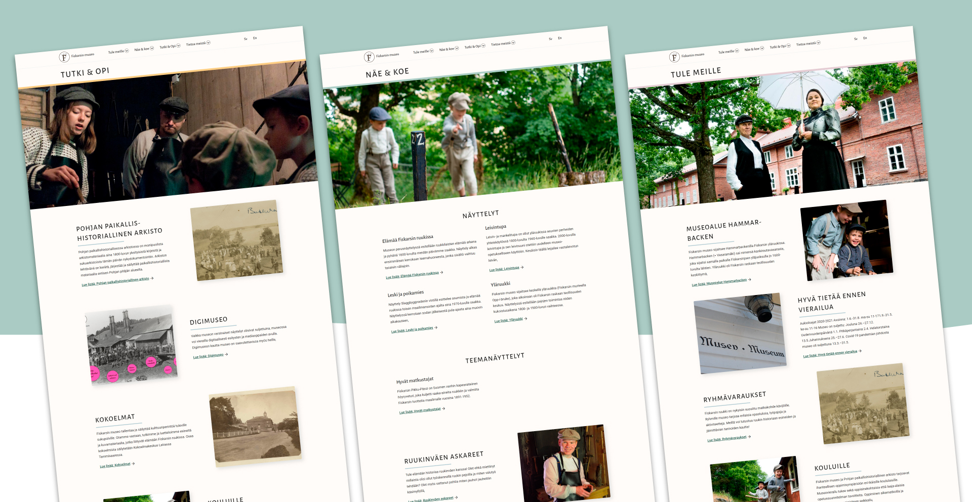 Fiskarsin museo on paikallismuseo, joka kertoo Fiskarsin ruukin elämästä ennen. Perusnäyttelyn lisäksi museossa ja siihen liittyvissä rakennuksissa järjestetään opastettuja kierroksia ja työpajatoimintaa, joissa päästään tutustumaan menneeseen maailmaan erilaisin kädentaidoin, esimerkiksi tinasotilaita valamalla. Museo lähestyi JCO:ta toiveenaan uudistaa verkkosivu palvelemaan museota ja sen toimintoja entistä paremmin. Sivustosta haluttiin elävä, lämminhenkinen ja museon ilmapiiriä välittävä. Sivuston sisältämät materiaalit haluttiin helpommin löydettäviksi ja sivusto kokonaisuudessaan sellaiseksi, jonka parissa kävijä viihtyisi entistä paremmin. Kieliversioita tuli olla kolme kattamaan kaksikielisen kunnan ja sen vierailijoiden tarpeet.