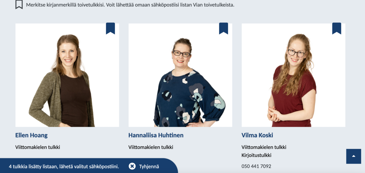 Selkeät ja saavutettavat verkkosivut. Sadan tulkin joukosta tulisi helposti löytää omiin tarpeisiin sopiva tulkki. Osumat sopivista tulkeista tulisi pystyä lähettämään sähköpostiin.